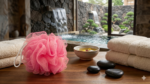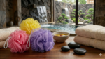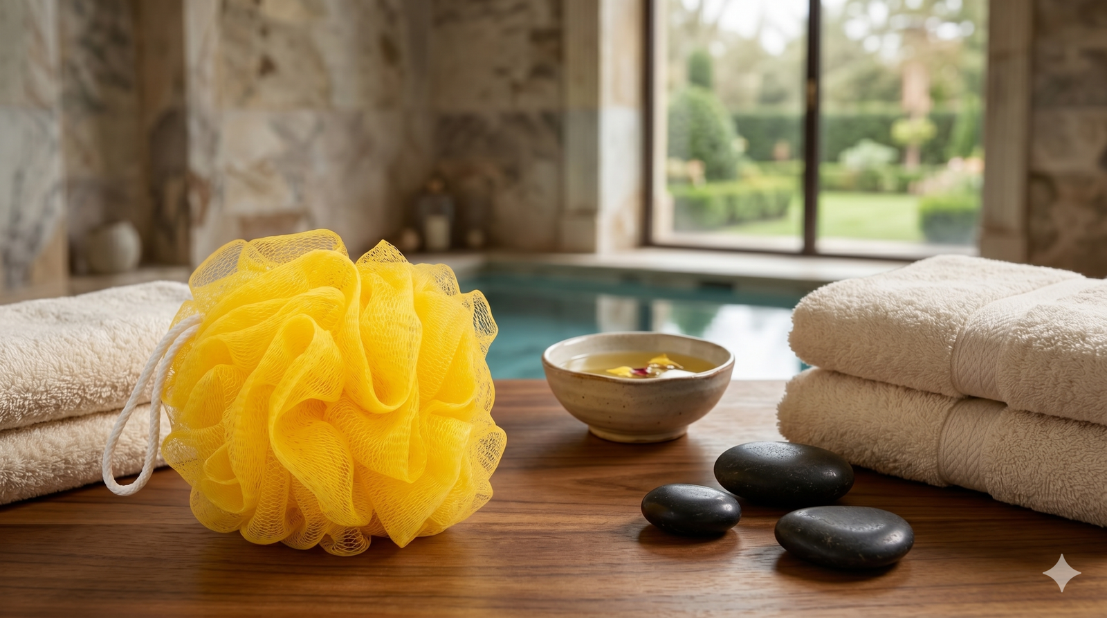 Esponja de malla amarilla ideal para el baño o spa.