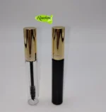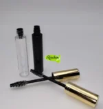 El frasco máscara rímel transparente con tapa dorada combina funcionalidad y estilo, ofreciendo un diseño práctico para el almacenamiento y aplicación de máscaras de pestañas o productos de belleza similares.