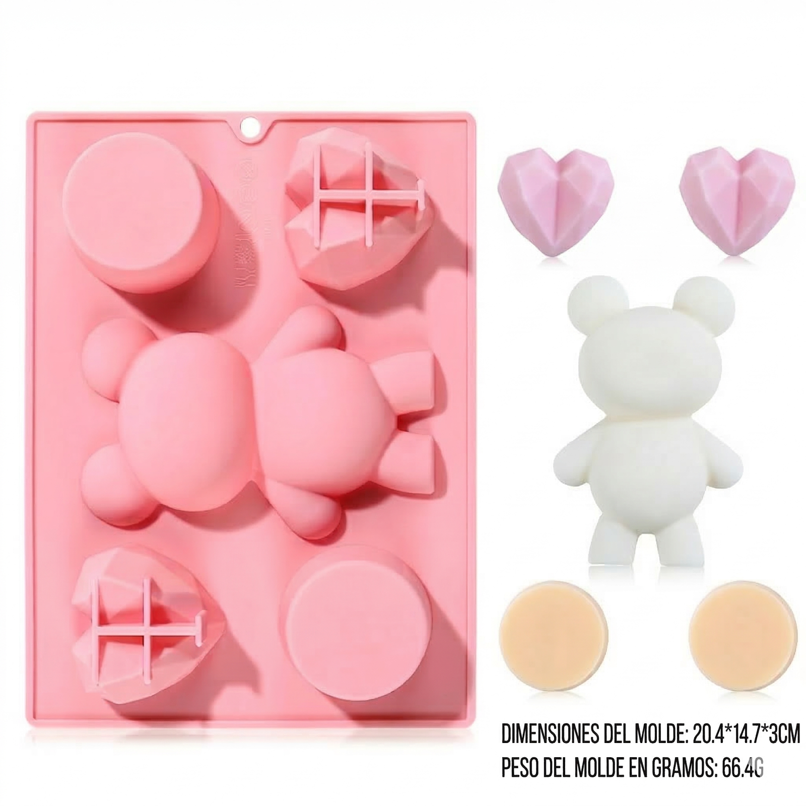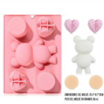 Molde de silicona grado comestible, con diseño de oso y corazones.