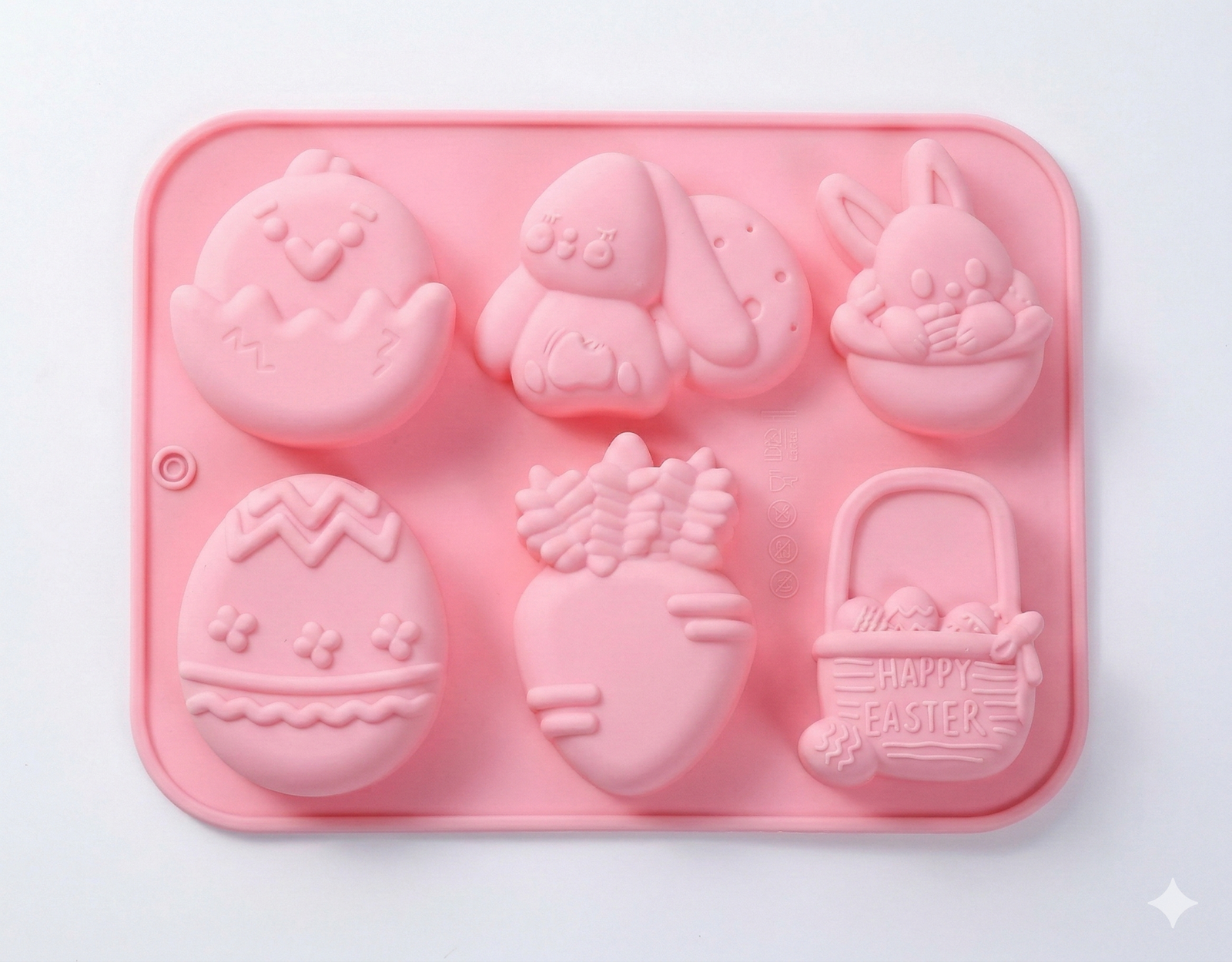 Molde de silicona grado comestible, color rosado con diseños de conejos y huevos de pascua.