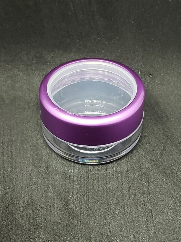 Pote acrílico transparente con tapa con borde violeta, para un contenido equivalente de 10 gr de agua.
